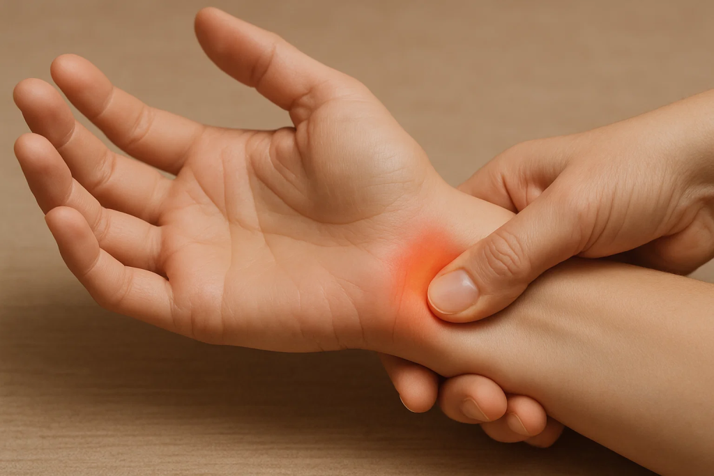 Apply pressure three finger-widths below the wrist crease, between the two tendons.